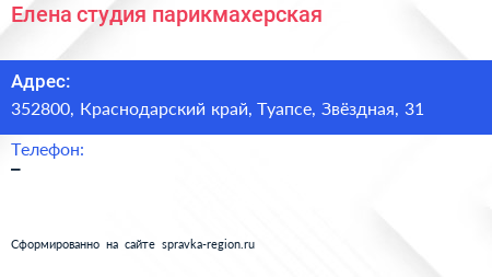 Елена, студия-парикмахерская по адресу 352800, Краснодарский край, Туапсе, Звёздная, 31 в дальнейшем Организация, размещена в следующих категориях: