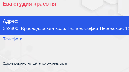 Ева, студия красоты по адресу 352800, Краснодарский край, Туапсе, Софьи Перовской, 16 в дальнейшем Организация, размещена в следующих категориях: