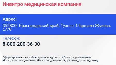 Инвитро, медицинская компания по адресу 352800, Краснодарский край, Туапсе, Маршала Жукова, 17/8 в дальнейшем Организация, размещена в следующих категориях: