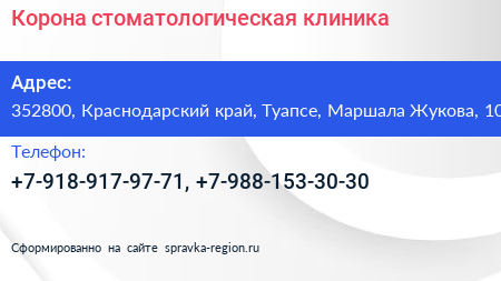 Корона, стоматологическая клиника по адресу 352800, Краснодарский край, Туапсе, Маршала Жукова, 10 в дальнейшем Организация, размещена в следующих категориях: