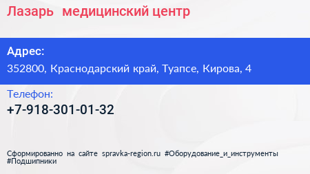 Лазарь+, медицинский центр по адресу 352800, Краснодарский край, Туапсе, Кирова, 4 в дальнейшем Организация, размещена в следующих категориях: