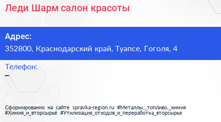 Леди Шарм, салон красоты по адресу 352800, Краснодарский край, Туапсе, Гоголя, 4 в дальнейшем Организация, размещена в следующих категориях: