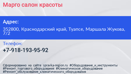 Марго, салон красоты по адресу 352800, Краснодарский край, Туапсе, Маршала Жукова, 7/2 в дальнейшем Организация, размещена в следующих категориях: