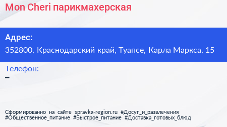 Mon Cheri, парикмахерская по адресу 352800, Краснодарский край, Туапсе, Карла Маркса, 15 в дальнейшем Организация, размещена в следующих категориях: