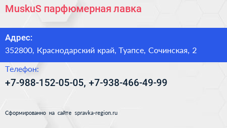 MuskuS, парфюмерная лавка по адресу 352800, Краснодарский край, Туапсе, Сочинская, 2 в дальнейшем Организация, размещена в следующих категориях: