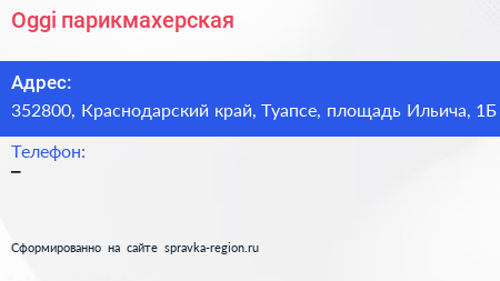 Oggi, парикмахерская по адресу 352800, Краснодарский край, Туапсе, площадь Ильича, 1Б в дальнейшем Организация, размещена в следующих категориях: