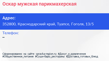 Оскар, мужская парикмахерская по адресу 352800, Краснодарский край, Туапсе, Гоголя, 13/5 в дальнейшем Организация, размещена в следующих категориях: