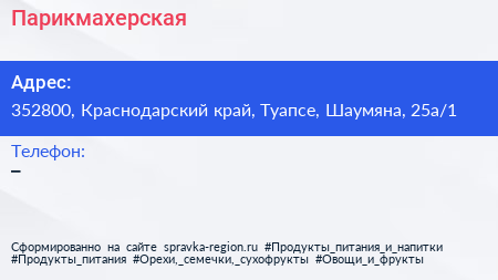 Парикмахерская по адресу 352800, Краснодарский край, Туапсе, Шаумяна, 25а/1 в дальнейшем Организация, размещена в следующих категориях: