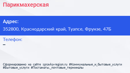 Парикмахерская по адресу 352800, Краснодарский край, Туапсе, Фрунзе, 47Б в дальнейшем Организация, размещена в следующих категориях:
