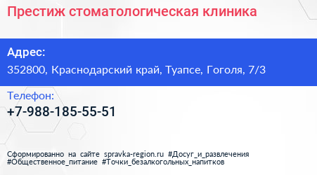Престиж, стоматологическая клиника по адресу 352800, Краснодарский край, Туапсе, Гоголя, 7/3 в дальнейшем Организация, размещена в следующих категориях: