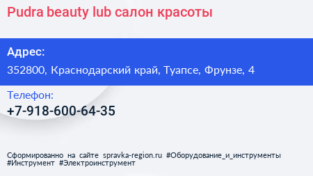 Pudra beauty lub, салон красоты по адресу 352800, Краснодарский край, Туапсе, Фрунзе, 4 в дальнейшем Организация, размещена в следующих категориях: