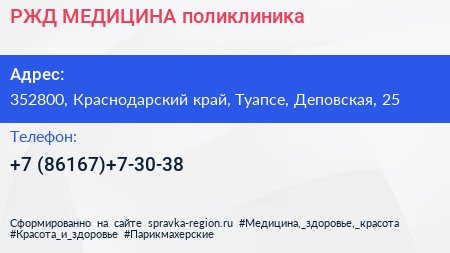 РЖД-МЕДИЦИНА, поликлиника по адресу 352800, Краснодарский край, Туапсе, Деповская, 25 в дальнейшем Организация, размещена в следующих категориях: