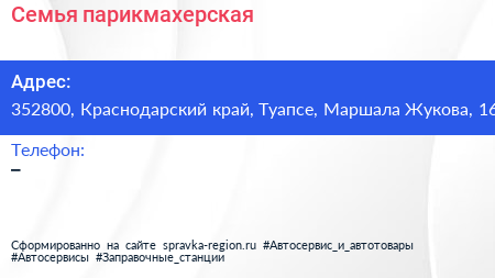 Семья, парикмахерская по адресу 352800, Краснодарский край, Туапсе, Маршала Жукова, 16 в дальнейшем Организация, размещена в следующих категориях: