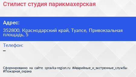 Стилист, студия-парикмахерская по адресу 352800, Краснодарский край, Туапсе, Привокзальная площадь, 5 в дальнейшем Организация, размещена в следующих категориях: