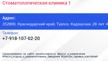 Стоматологическая клиника №1 по адресу 352800, Краснодарский край, Туапсе, Кадошская, 28 лит А в дальнейшем Организация, размещена в следующих категориях: