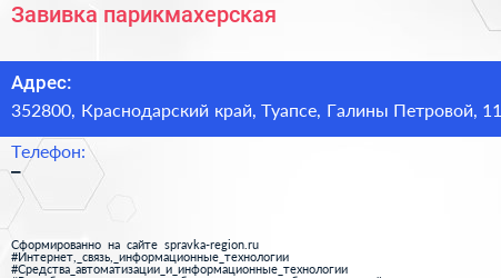 Завивка, парикмахерская по адресу 352800, Краснодарский край, Туапсе, Галины Петровой, 11 в дальнейшем Организация, размещена в следующих категориях: