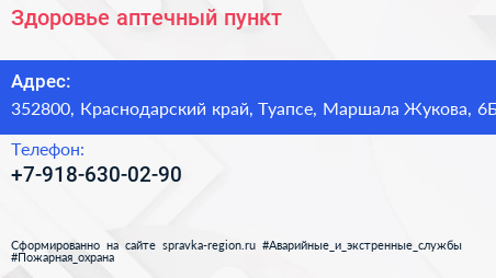 Здоровье, аптечный пункт по адресу 352800, Краснодарский край, Туапсе, Маршала Жукова, 6Б в дальнейшем Организация, размещена в следующих категориях: