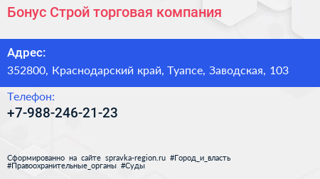 Бонус Строй, торговая компания по адресу 352800, Краснодарский край, Туапсе, Заводская, 103 в дальнейшем Организация, размещена в следующих категориях: