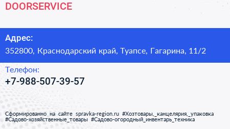 DOORSERVICE по адресу 352800, Краснодарский край, Туапсе, Гагарина, 11/2 в дальнейшем Организация, размещена в следующих категориях: