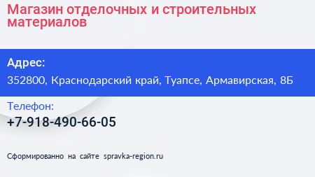 Магазин отделочных и строительных материалов по адресу 352800, Краснодарский край, Туапсе, Армавирская, 8Б в дальнейшем Организация, размещена в следующих категориях: