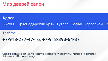 Мир дверей, салон по адресу 352800, Краснодарский край, Туапсе, Софьи Перовской, 16 в дальнейшем Организация, размещена в следующих категориях: