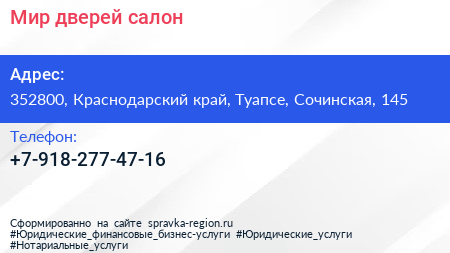 Мир дверей, салон по адресу 352800, Краснодарский край, Туапсе, Сочинская, 145 в дальнейшем Организация, размещена в следующих категориях: