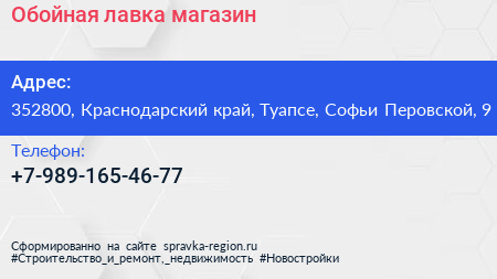 Обойная лавка, магазин по адресу 352800, Краснодарский край, Туапсе, Софьи Перовской, 9 в дальнейшем Организация, размещена в следующих категориях: