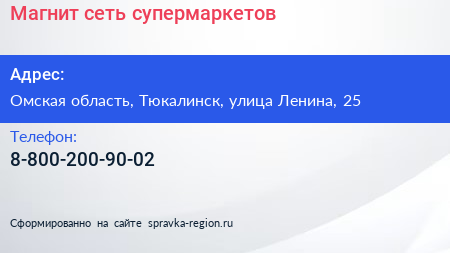 Магнит, сеть супермаркетов по адресу Омская область, Тюкалинск, улица Ленина, 25 в дальнейшем Организация, размещена в следующих категориях: