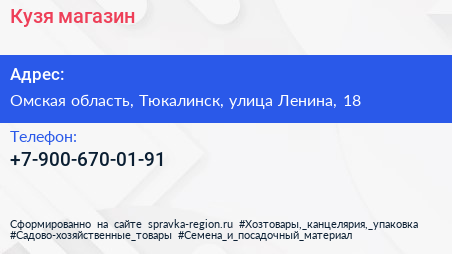 Кузя, магазин по адресу Омская область, Тюкалинск, улица Ленина, 18 в дальнейшем Организация, размещена в следующих категориях: