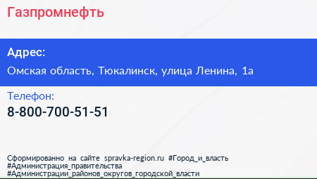 Газпромнефть по адресу Омская область, Тюкалинск, улица Ленина, 1а в дальнейшем Организация, размещена в следующих категориях: