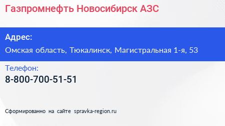 Газпромнефть-Новосибирск, АЗС по адресу Омская область, Тюкалинск, Магистральная 1-я, 53 в дальнейшем Организация, размещена в следующих категориях:
