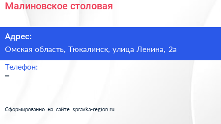 Малиновское, столовая по адресу Омская область, Тюкалинск, улица Ленина, 2а в дальнейшем Организация, размещена в следующих категориях: