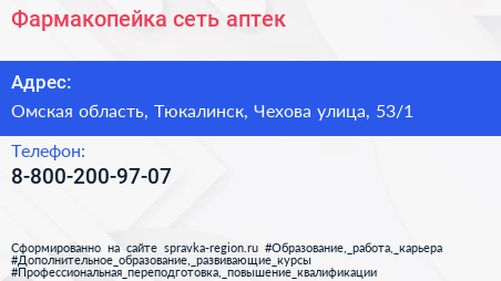 Фармакопейка, сеть аптек по адресу Омская область, Тюкалинск, Чехова улица, 53/1 в дальнейшем Организация, размещена в следующих категориях: