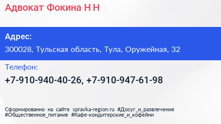 Адвокат Фокина Н.Н. по адресу 300028, Тульская область, Тула, Оружейная, 32 в дальнейшем Организация, размещена в следующих категориях: