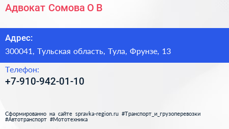 Адвокат Сомова О.В. по адресу 300041, Тульская область, Тула, Фрунзе, 13 в дальнейшем Организация, размещена в следующих категориях: