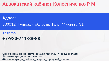 Адвокатский кабинет Колесниченко Р.М. по адресу 300012, Тульская область, Тула, Михеева, 31 в дальнейшем Организация, размещена в следующих категориях: