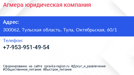 Агмера, юридическая компания по адресу 300062, Тульская область, Тула, Октябрьская, 60/1 в дальнейшем Организация, размещена в следующих категориях: