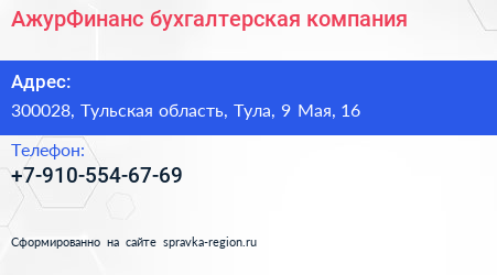 АжурФинанс, бухгалтерская компания по адресу 300028, Тульская область, Тула, 9 Мая, 16 в дальнейшем Организация, размещена в следующих категориях: