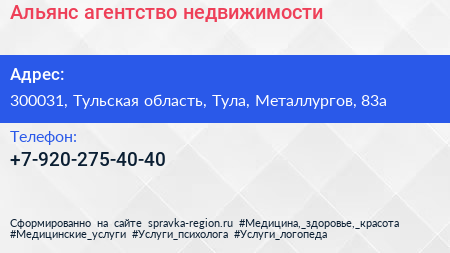 Альянс, агентство недвижимости по адресу 300031, Тульская область, Тула, Металлургов, 83а в дальнейшем Организация, размещена в следующих категориях: