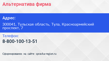 Альтернатива, фирма по адресу 300041, Тульская область, Тула, Красноармейский проспект, 7 в дальнейшем Организация, размещена в следующих категориях: