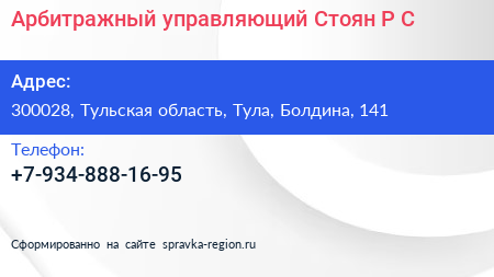 Арбитражный управляющий Стоян Р.С. по адресу 300028, Тульская область, Тула, Болдина, 141 в дальнейшем Организация, размещена в следующих категориях: