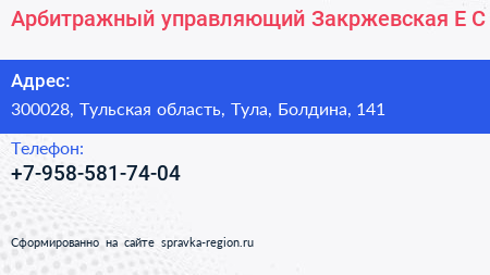 Арбитражный управляющий Закржевская Е.С. по адресу 300028, Тульская область, Тула, Болдина, 141 в дальнейшем Организация, размещена в следующих категориях: