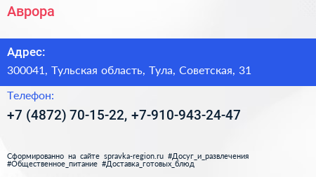 Аврора по адресу 300041, Тульская область, Тула, Советская, 31 в дальнейшем Организация, размещена в следующих категориях: