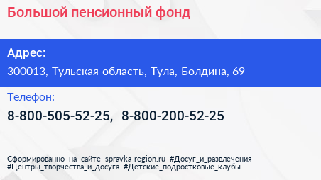 Большой пенсионный фонд по адресу 300013, Тульская область, Тула, Болдина, 69 в дальнейшем Организация, размещена в следующих категориях: