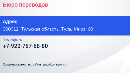 Бюро переводов по адресу 300012, Тульская область, Тула, Мира, 60 в дальнейшем Организация, размещена в следующих категориях: