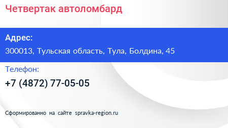Четвертак, автоломбард по адресу 300013, Тульская область, Тула, Болдина, 45 в дальнейшем Организация, размещена в следующих категориях: