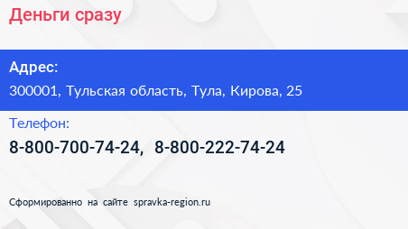 Деньги сразу по адресу 300001, Тульская область, Тула, Кирова, 25 в дальнейшем Организация, размещена в следующих категориях: