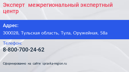 Эксперт+, межрегиональный экспертный центр по адресу 300028, Тульская область, Тула, Оружейная, 58а в дальнейшем Организация, размещена в следующих категориях: