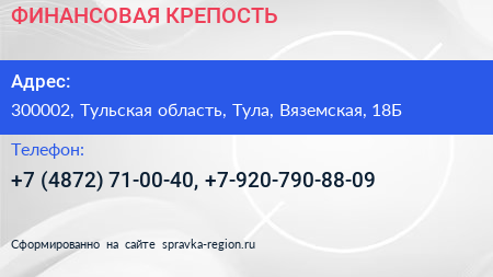 ФИНАНСОВАЯ КРЕПОСТЬ по адресу 300002, Тульская область, Тула, Вяземская, 18Б в дальнейшем Организация, размещена в следующих категориях: