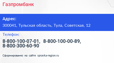 Газпромбанк по адресу 300041, Тульская область, Тула, Советская, 12 в дальнейшем Организация, размещена в следующих категориях: